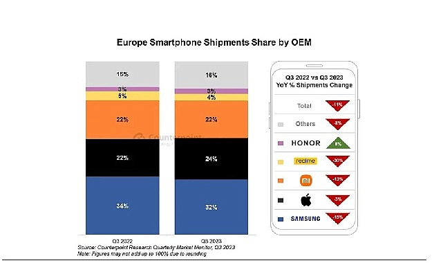 Counterpoint’in yayınladığı araştırmaya nazaran HONOR, 2023’ün üçüncü çeyreğinde yıllık bazda büyüyen tek marka olarak dikkatleri üzerine çekti.